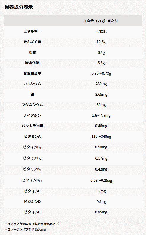 ※1食分(21g)当たり ・10種のビタミンと3種のミネラル配合 運動する女性のカラダづくりをサポートする6種のビタミンB群と ビタミンA、ビタミンC、ビタミンD、ビタミンEに加えて、カルシウム、鉄、 マグネシウムを配合しています。