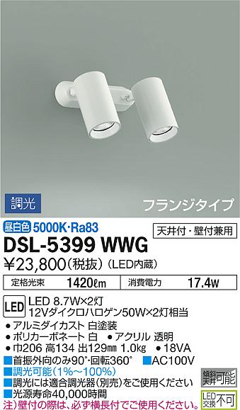照明 おしゃれ かわいい 屋内大光電機 DAIKO 調光スポットライトDSL-5399WWG 直付けタイプ白塗装 集光タイプ 30°天井付・壁付兼用 LED昼白色 白熱灯100W×2灯相当 シンプル モダン