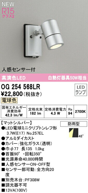 ★オーデリック OG254568LR エクステリア 人感センサー付LEDスポットライト 白熱灯器具50W相当 高演色R15 クラス2 電球色 非調光 防雨型 照明器具 アウトドアライト