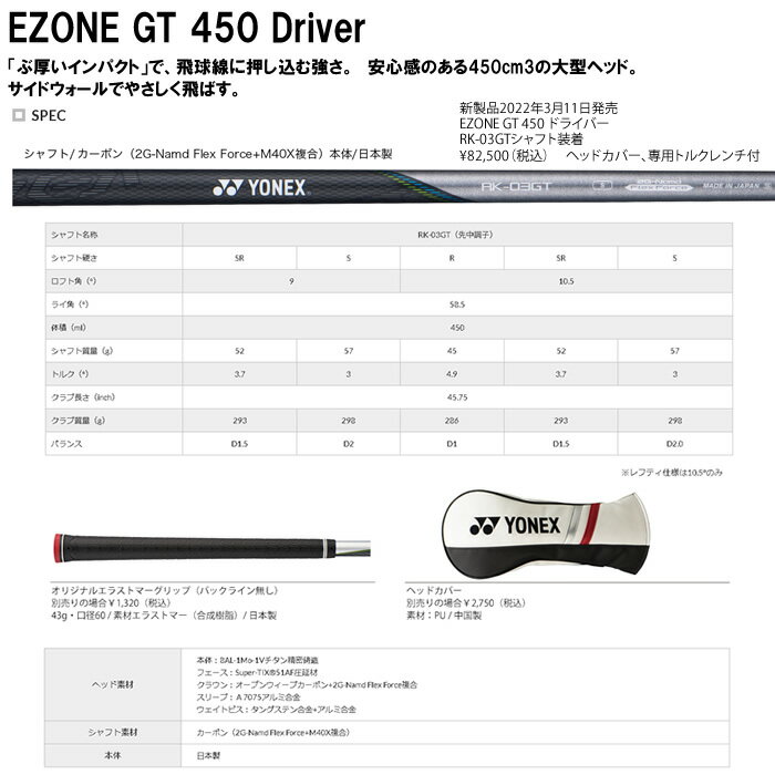 【2022年モデル】【ヨネックス】 EZONE GT 450 DRIVER 9°/10.5° イーゾーン GT 450 ドライバー RK-03GT カーボンシャフト/一部特注品 ヘッドカバー・専用レンチ付【YONEX】【送料無料】