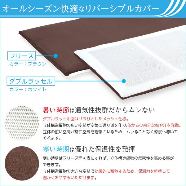 商品に関しまして【商品について】(体圧分散 通気 衛生 リバーシブル 日本産)■サイズ:外寸:(約)幅97x奥行き200x高さ3cm※商品重量:(約)3kg■カラー:通常販売分■素材:中材:立体構造編物(ポリエステル100%)側地:片面/フリース(ポリエステル100%)片面/Wラッセル(ポリエステル100%(170g/m2))■その他:・完成品でのお届けです。
