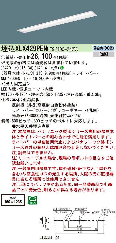 【納期未定】【最安値挑戦中!最大25倍】パナソニック XLX429PENLE9 一体型LEDベースライト 非調光 昼白色 iDシリーズ リニューアル用 40形 天井埋込型