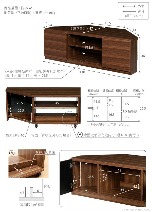 天板耐荷重50kg、テレビサイズ目安37V型までサイズ(cm):幅110x奥行47x高さ36・約22kgカラー:ホワイト(前板鏡面タイプ)・ブラック(前板鏡面タイプ)・ウォールナット材質:本体-プリント紙化粧パーティクルボード(木目タイプ)、前板-合成樹脂化粧繊維板組立品梱包サイズ幅135x奥行52x高さ9cmその他※配達地域や交通事情、天候により希望配達日時にお届けできない場合がございます。
