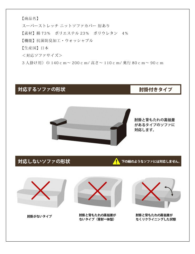 素材:綿73% ポリエステル23% ポリウレタン 4%機能:抗菌防臭加工・ウォッシャブル生産国:日本<対応ソファサイズ>3人掛け用)巾140cm〜200cm/高さ〜110cm/奥行80cm〜90cm【代引きについて】こちらの商品は、代引きでの出荷は受け付けておりません。