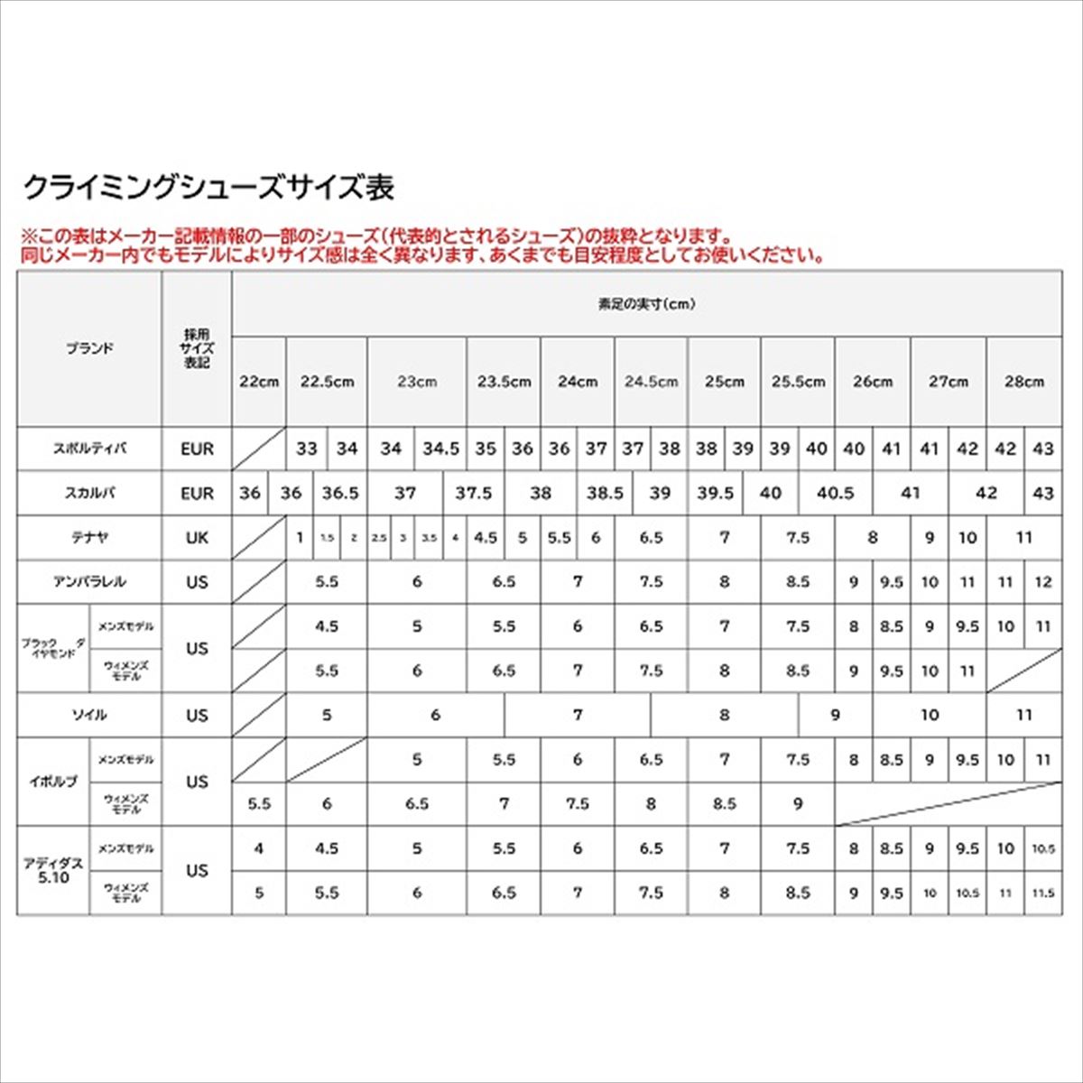 ボディー材質 / 合皮(シンスラテックスVX) アッパー、 ライナー無し ミッドソール / MX-R1. 0 ハーフレングス・ラバー ソール / 4.0mm TRAX SAS サイズ / USW4(20.5cm)〜9(25.5cm)(ハーフ刻み)【クライミングシューズサイズ表について】 素足の実寸による各メーカーごとのサイズ換算表を画像二枚目に配置してあります。